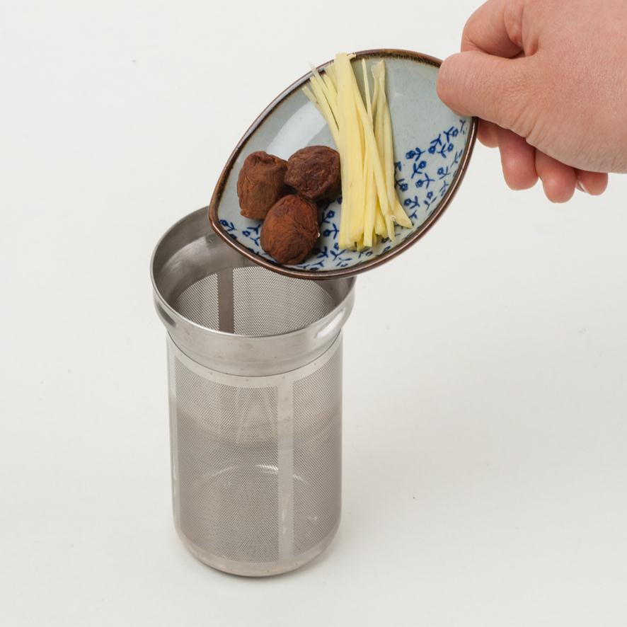 2.将话梅和姜丝放入养生壶的过滤茶篮中,黄酒倒入养生壶中。