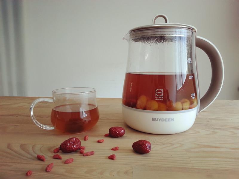 3、把红枣、桂圆、枸杞、红糖放入北鼎养生壶中,加水至1500ml水位线,启动养生汤模式。