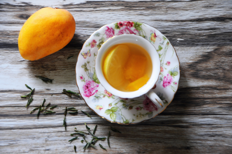 3.待养生壶自动断电后放入冰糖,在茶篮内放入茶叶,焖泡三分钟;同时将煮好的芒果茶晾凉一些,放入柠檬片泡5分钟即可。