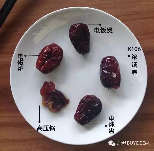 ▲与银耳一样,高压锅煮的红枣也烂得不成“枣”形,电磁炉、电饭煲、电炖盅基本上都没烂,K106浓汤壶稍烂