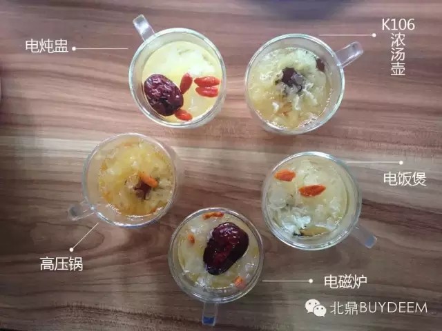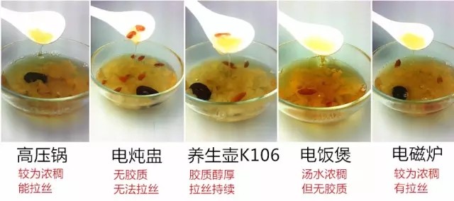 可以看出,电高压锅的汤色最深,K106次之,其它颜色比较白