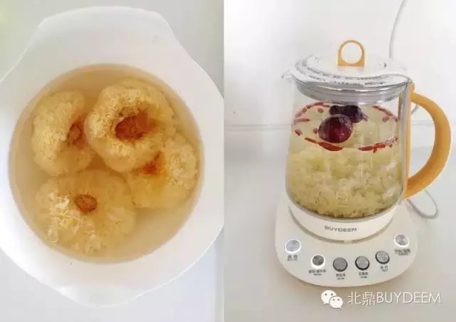 ▲左边的银耳用于其它炊具,用温水泡两个小时,另取半朵银耳泡五分钟然后撕碎放到K106用温泡模式泡发