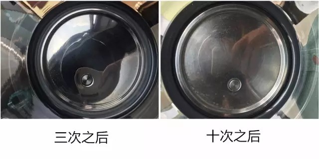 我们倒入500ml的西安自来水样品水。使用“烧开”功能,完成后将水倒掉。并重复3次。3次之后,发热盘已经出现些许浅白色斑点,这些就是水垢。继续重复7次之后,斑点已经相当明显,发热盘也光泽不再。