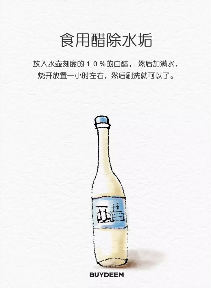 这个方法是最简单也是最实用的方法,大家都知道水垢的主要成分是碳酸钙等碳酸盐,醋里面的醋酸会与其发生反应,产生溶于水的物质矿物质和二氧化碳气体,一般超市都能买到白醋,放入大约100ml白醋, 然后加满水,烧开放置一小时左右,然后刷洗就可以了,陈醋也可以,但陈醋的效果没有白醋的好。