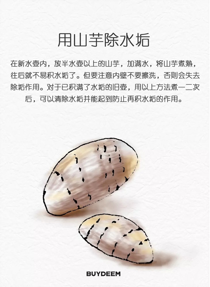在新电水壶内,放半水壶以上的山芋,加满水,将山芋煮熟,煮一二次后,不仅原来的水垢会逐渐脱落,并能起到防止再积水垢的作用。