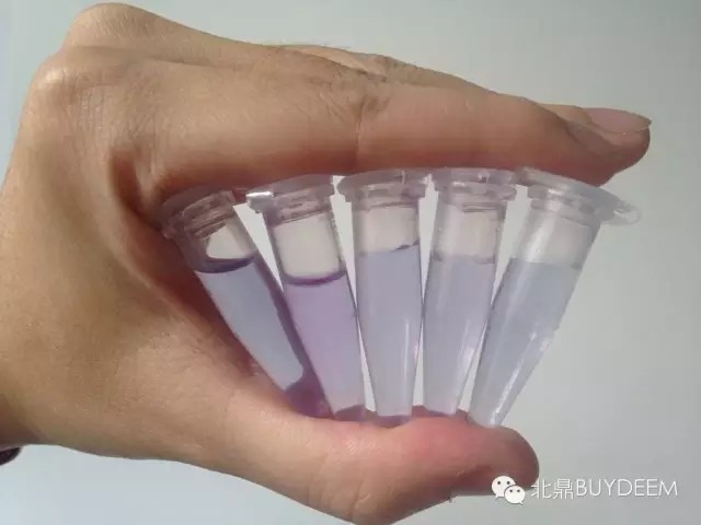 然后小北就用刚才泡四种银耳的水做测试,一二三四号的分别是一二三号银耳,五号是纯净水。等待5分钟,结果出来了!!